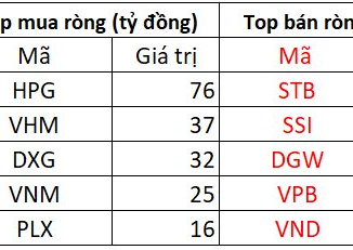 Trên HOSE, khối ngoại bán ròng xấp xỉ 412 tỷ đồng; trong khi HPG được mua ròng mạnh nhất 76 tỷ, STB lại bị bán ròng tới 287 tỷ đồng.