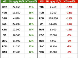 Trên sàn HOSE, top 10 cổ phiếu tăng mạnh nhất tuần qua đều có mức tăng từ 11-21%.