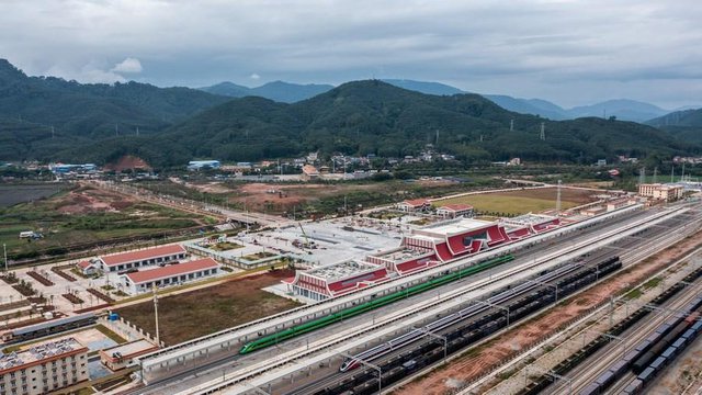 Tàu cao tốc “viên đạn” (màu xanh lá) trên tuyến Vientiane – Côn Minh chụp từ trên không tại trạm Mohan, Vân Nam, Trung Quốc. Ảnh: Tân Hoa xã.