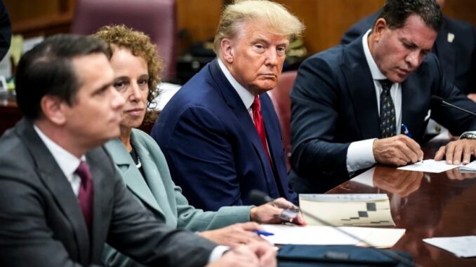 Ông Trump và đội ngũ pháp lý có mặt tại phòng xử án ở Manhattan ngày 4/4. Ảnh: AP.