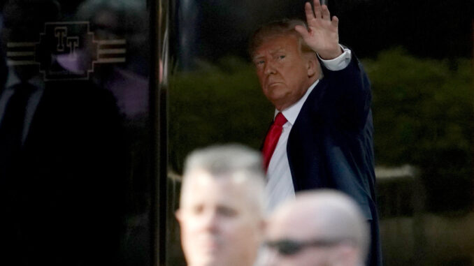 Ông Trump vẫy chào công chúng khi đến Tháp Trump ở quận Manhattan – TP New York hôm 3-4 – Ảnh: REUTERS