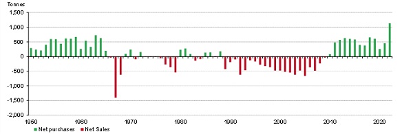 Quay lại năm 2022, tình hình đã thay đổi rất nhiều. Thị trường vàng sâu rộng hơn và lưu thông dễ dàng hơn. Cấu trúc ngày nay đã khác biệt – cụ thể là việc giải phóng và tăng trưởng của cả Ấn Độ và Trung Quốc cùng với việc xuất hiện các quỹ ETF vàng. Nhưng sự khác biệt quan trọng nhất nằm ở hành vi của các ngân hàng trung ương, đó là: