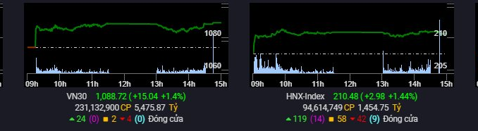 Kết phiên giao dịch, VN-Index tăng 14,64 điểm (+1,38%) tiến sát mốc 1.080 điểm; HNX-Index 2,98 điểm lên 210,48 điểm; UpCOM-Index tăng 0,51 điểm lên 77,28 điểm. Thanh khoản trên HoSE tăng 25% so với phiên trước, giá trị khớp lệnh đạt xấp xỉ 13.116 tỷ đồng.