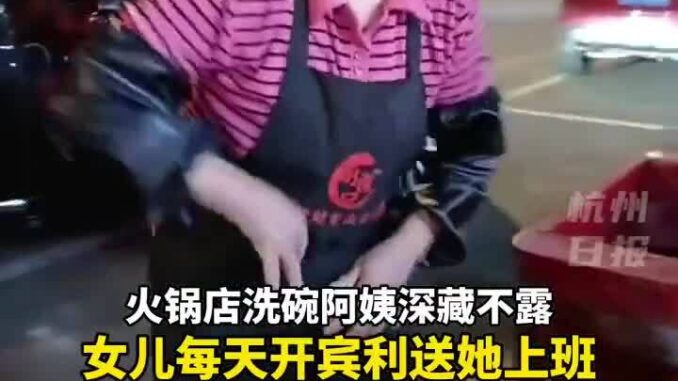 Trong video được lan truyền mạnh trên mạng xã hội Trung Quốc, người phụ nữ trung niên tóc bạc mặc áo kẻ hồng, mặc tạp dề, đeo bọc tay cao su, bước xuống một chiếc xe Bentley màu đen đỗ trước cổng nhà hàng lẩu ở Thành Đô, tỉnh Tứ Xuyên, ngày 1/4.