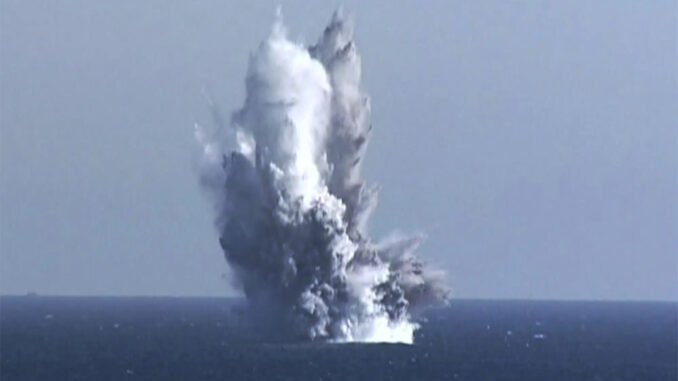 Vụ nổ giữa cuộc thử nghiệm phương tiện tấn công hạt nhân dưới nước của Triều Tiên trong ảnh công bố ngày 23/3. Ảnh: KCNA