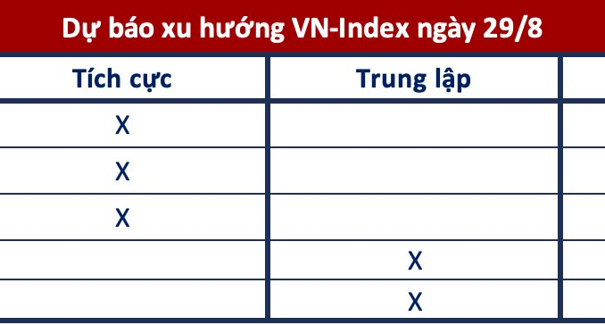 Chứng khoán TPS: VN-Index nhanh chóng tăng điểm trở lại sau phiên điều chỉnh trước đó và đóng cửa trên mức 1.200 điểm, cho thấy tâm lý nhà đầu tư đã tích cực hơn và lực bán tại ngưỡng cản 1.200 điểm cũng không còn quá lớn. Hiện tại, VN-Index được kỳ vọng sẽ có phiên tăng giá đầy mạnh mẽ ở ngày 29/8, qua đó giúp chỉ số vượt hoàn toàn khỏi vùng cản 1.200-1.210 điểm, từ đó giúp thị trường bứt phá trở lại và hướng đến mục tiêu là đỉnh 52 tuần (quanh mức 1.300 điểm).
