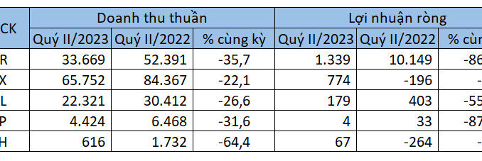 Thương mại Đầu tư Dầu khí Nam Sông Hậu (HoSE: PSH) và Thalexim (UPCoM: TLP) ghi nhận giảm doanh thu quý II lần lượt 64% và 32%. Song, trong khi PSH chuyển lỗ thành lãi thì Thalexim lãi giảm 88%.