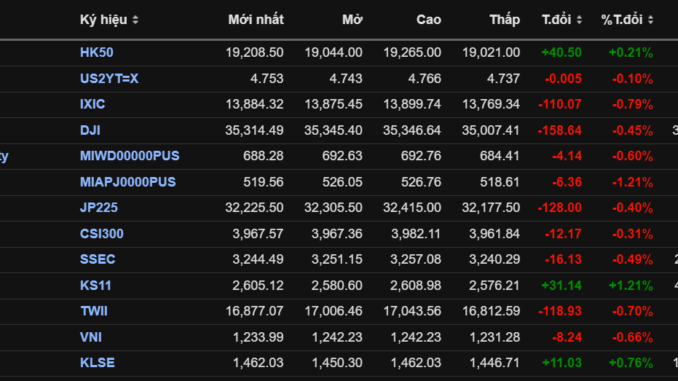 Các chỉ số CSI 300 (-0,31%), SHCMP (-0,49%) đóng cửa trong sắc đỏ. Các chỉ số NIKKEI 225 (-0,4%), TWSE (-0,7%) cũng đều giảm theo.