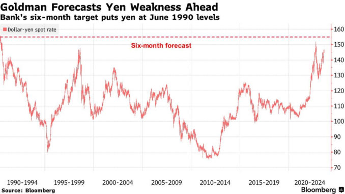 Báo cáo do nhóm chiến lược gia dẫn đầu bởi Kamakshya Trivedi nhận định, trong 6 tháng tới, đồng yên có thể chạm mốc 155 yên đổi 1 USD – mức thấp nhất kể từ tháng 6/1990. Trong lần dự báo trước, Goldman Sachs đưa ra con số 135.