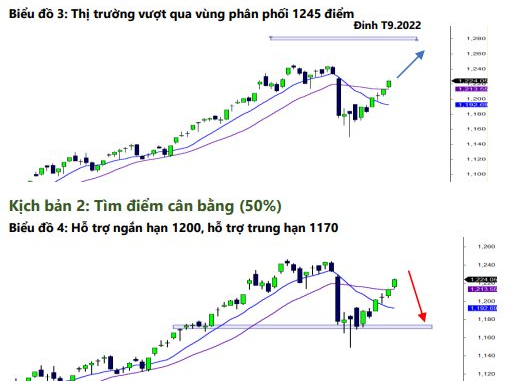 Thứ hai , với kịch bản thị trường chịu áp lực cản tại vùng 1.245 điểm, việc thị trường vượt đỉnh trong nghi ngờ đi kèm thanh khoản thấp có thể dẫn tới rủi ro xuất hiện những nhịp điều chỉnh ngắn. Trong trường hợp này, nhà đầu tư có thể vận dụng chiến lược giải ngân sớm khi xuất hiện điều chỉnh quanh vùng 1.200 điểm (+/- 10 điểm).
