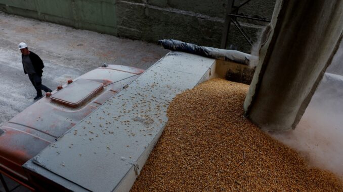 Ngũ cốc Ukraine được chất lên một chiếc xe tải ở Chernihiv vào tháng 5-2022. Ảnh: Reuters