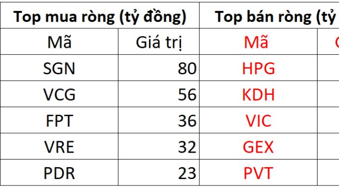 Tại chiều mua, SGN được mua ròng mạnh nhất với giá trị 80 tỷ đồng. Bên cạnh đó, VCG xếp tiếp theo danh sách mua ròng mạnh trên HoSE với 56 tỷ đồng. Ngoài ra, khối ngoại cũng mua ròng FPT với giá trị là 36 tỷ đồng.