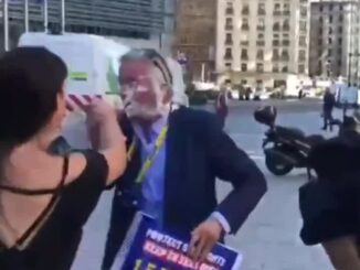 Michael O’Leary, ông chủ Ryanair, hãng hàng không ở châu Âu, bị hai nhà hoạt động môi trường úp bánh kem vào mặt bên ngoài trụ sở Ủy ban châu ÂU.