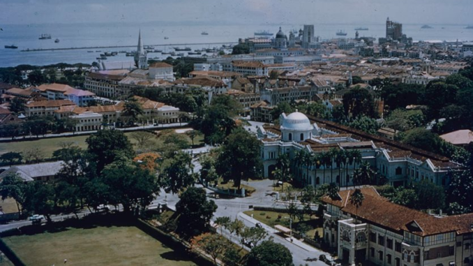 Quang cảnh con đường Stamford Road nhìn ra bến cảng Singapore. Bảo tàng Quốc gia và toà nhà YMCA cũ phía bên phải. Phía sau là Nhà thờ Thánh Andrew và Toà án Tối cao. Bức ảnh này được chụp vào cuối những năm 1950, trước khi Thư viện Quốc gia được xây dựng.