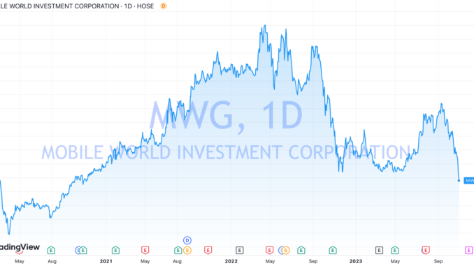 Thực tế, đà giảm của MWG bắt đầu từ giữa tháng 9 sau khi cổ phiếu này lên đỉnh một năm. Sau chưa đầy 2 tháng, cổ phiếu bán lẻ này đã mất 39% thị giá. Giá trị vốn hóa thị trường của Thế Giới Di Động cũng theo đó “bốc hơi” gần 32.800 tỷ đồng (~1,3 tỷ USD), chỉ còn khoảng hơn 51.000 tỷ đồng.