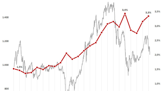 So sánh với điểm số thị trường, tỷ lệ dư nợ margin/vốn hóa thị trường tiến sát vùng đỉnh trong bối cảnh VN-Index loanh quanh trong việc giữ mốc 1.100 điểm. Nhìn rộng ra trong giai đoạn đầu năm 2018, chỉ số chính sàn HoSE cùng ở ngưỡng điểm tương đương song tỷ lệ dư nợ margin/vốn hóa thị trường chỉ khoảng 1,5%. Như vậy có thể thấy, nhà đầu tư trên thị trường chứng khoán Việt Nam đang mạnh dạn hơn trong việc vay nợ để đầu tư dù VN-Index “dậm chân tại chỗ”.
