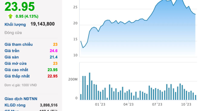 Trên thị trường, cổ phiếu HPG hiện đang dừng ở mức 23.950 đồng/cp, giảm hơn 17% so với đỉnh 17 tháng đạt được hồi đầu tháng 9. Dù vậy, mức thị giá này vẫn cao hơn 33% so với thời điểm đầu năm 2023.
