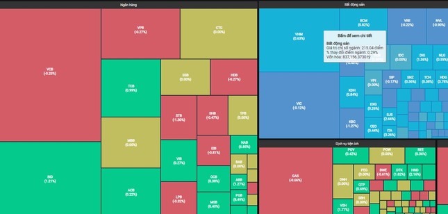 Cổ phiếu ngân hàng có sự phân hóa khi STB, SHB, VPB… đồng loạt nhuốm đỏ, trong khi TCB, MSB, NAB, VIB khoác sắc xanh. Đáng chú ý, VCB tiếp tục phiên giảm điểm thứ 5 liên tiếp, trở thành một trong những mã tác động tiêu cực nhất đến thị trường. Cổ phiếu bất động sản có sự giằng co khi số mã tăng và giảm xấp xỉ nhau. Trong bối cảnh giao dịch ảm đạm, dòng tiền vào bất động sản cũng giảm đáng kể, chỉ khoảng hơn 2.100 tỷ đồng.