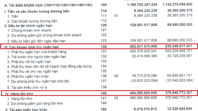 Các khoản phải thu ngắn hạn và Hàng tồn kho chiếm phần lớn giá trị tài sản ngắn hạn của Vinaconex 25.