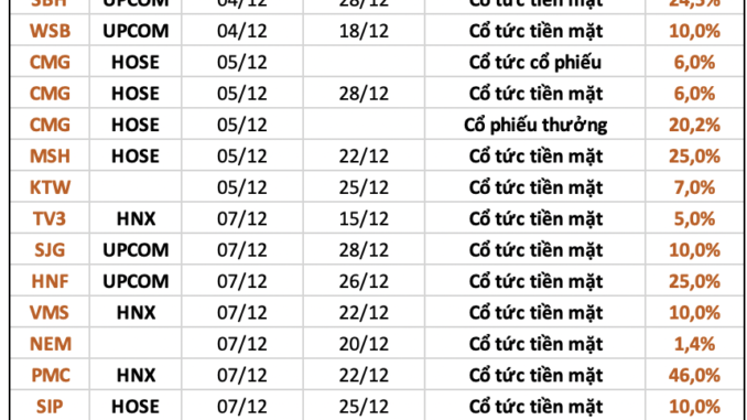 Lịch chốt quyền cổ tức tuần 4-8/12: Cổ tức tiền mặt cao nhất 46%
