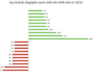Trên sàn HOSE, top 10 cổ phiếu tăng cao nhất là 18% và thấp nhất là 12%.