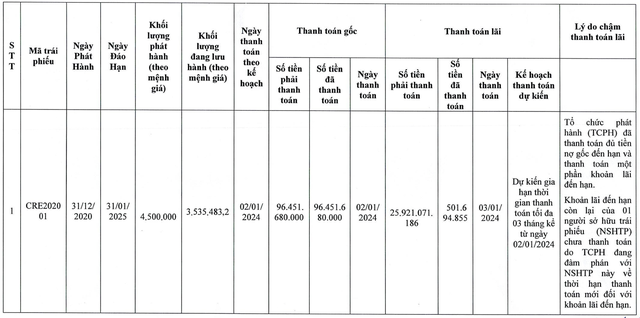 CTCP Bất động sản Thế Kỷ (Cen Land – mã CRE) vừa công bố thông tin bất thường về việc chậm trả lãi trái phiếu CRE202001. Theo đó, lãi tới ngày 3/1/2024 phải thanh toán hơn 25,92 tỷ đồng nhưng công ty chỉ mới thanh toán được hơn 500 triệu đồng. Trước đó, Cen Land đã thanh toán toàn bộ hơn 96,45 tỷ đồng tiền gốc đến hạn của mã trái phiếu này.
