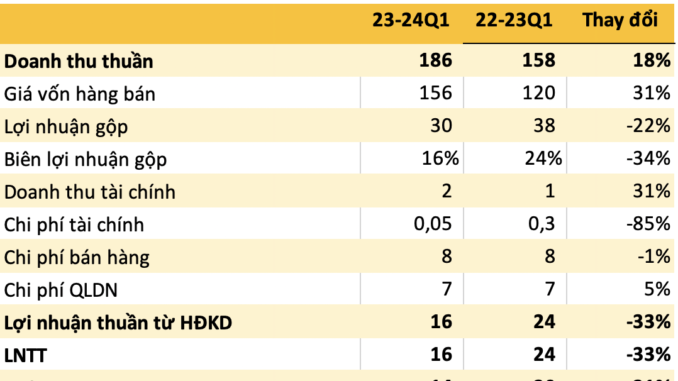 Trong niên độ 2023 – 2024, công ty đặt mục tiêu doanh thu 560 tỷ đồng, giảm 8% so với cùng kỳ và lãi sau thuế kỳ vọng đạt ít nhất 70 tỷ đồng, giảm 39%. Như vậy sau quý 1, công ty đã hoàn thành 33% kế hoạch doanh thu và 20% mục tiêu lợi nhuận.