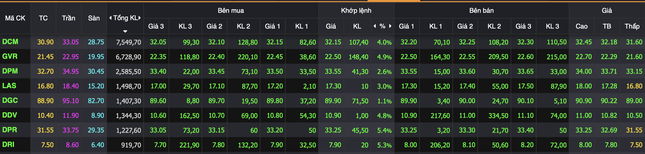 Các cổ phiếu khác trong nhóm cao su, như DRP, DRC cũng tăng giá. Trong đó, DRP tăng 5,4%. Cổ phiếu lớn điều chỉnh, dòng tiền có xu hướng lan toả, tìm kiếm cơ hội ở ngành, cổ phiếu nhỏ, vừa, tập trung ở nhóm nhựa, hoá chất. DCM, DPM, LAS, DGC, DDV… cùng tăng giá. VFG tăng kịch trần.