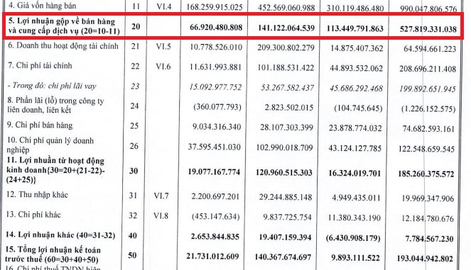 Trong kỳ, lợi nhuận gộp đạt 67 tỷ đồng, giảm 41% so với cùng kỳ; doanh thu tài chính đạt 11 tỷ đồng, giảm 27,6% so với cùng kỳ; chi phí tài chính đạt 11,6 tỷ đồng, giảm 74% so với cùng kỳ; chi phí bán hàng và quản lý doanh nghiệp là 46,6 tỷ đồng, giảm 30,4% so với cùng kỳ.