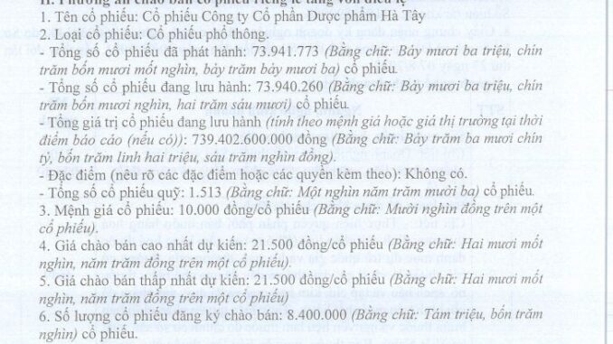 Dược phẩm Hà Tây phát hành thêm 8,4 triệu cổ phiếu theo hình thức chào bán riêng lẻ.