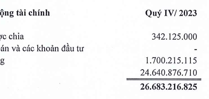 Tuy nhiên, nguồn thu lớn nhất của VNB lại không đến từ lĩnh vực kinh doanh cốt lõi mà từ hoạt động tài chính. Quý 4/2023, doanh thu tài chính của công ty đạt 26,7 tỷ đồng, tăng gần 38% so với cùng kỳ 2022. Trong đó, lãi cho vay đạt 24,6 tỷ đồng, tăng 45,5% so với quý 4/2022, chiếm 92% doanh thu tài chính.
