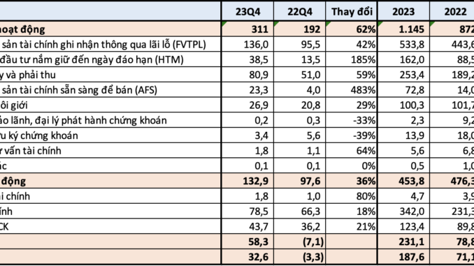 Hoạt động cho vay và môi giới đều khởi sắc. Lãi từ cho vay và phải thu đạt gần 81 tỷ đồng, tăng 59% so với cùng kỳ 2022. Trong khi đó, doanh thu môi giới cũng tăng 29% so với quý 4/2022, đạt gần 27 tỷ đồng.