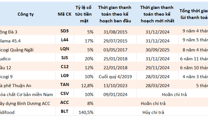 Hàng loạt cái tên khác cũng tương đối “chây ỳ” trong việc thanh toán cổ tức cho cổ đông như CTCP Cầu 12 (gần 7 năm), Licogi 9 (hơn 4 năm), Cà phê Thuận An (5 tháng). Thậm chí có trường hợp cá biệt khi hủy chi trả cổ tức ghi nhận tại CTCP Lương thực Bình Định (Bidifood, BLT).