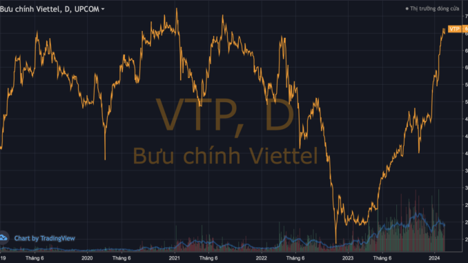 Trước thông tin chuyển sàn, cổ phiếu VTP đã liên tục tăng mạnh qua đó leo lên gần đỉnh lịch sử. Từ đầu tháng 11/2023 đến nay, thị giá cổ phiếu này đã tăng hơn 72%. Giá trị vốn hóa thị trường của Viettel Post cũng theo đó tăng lên mức 8.400 tỷ đồng, gấp 2,7 lần so với thời điểm một năm trước.