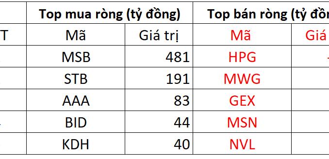 Tại chiều mua, tâm điểm mua ròng là cổ phiếu ngân hàng MSB với giá trị 481 tỷ đồng. Đây cũng là phiên thứ hai liên tiếp MSB được mua ròng mạnh nhất trên HOSE. Theo sau, STB, BID được mua ròng với giá trị 191 và 44 tỷ đồng. Bên cạnh đó, cổ phiếu AAA và KDH cũng được mua ròng trên HoSE với 83 và 40 tỷ đồng.
