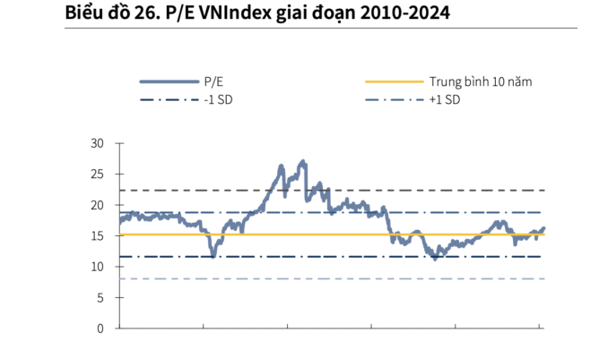 Về mặt định giá, mức P/E hiện tại của VN-Index khoảng 16.2x lần (theo số liệu từ Bloomberg – mức P/E này đã loại bỏ các lợi nhuận bất thường của doanh nghiệp nên có sự khác biệt so với tính toán của các tổ chức khác). Mức định giá này hiện đang tiến đến vùng cao trong trung bình 2 năm nhưng nhỉnh hơn không quá nhiều so với mức trung bình 10 năm của VN-Index.