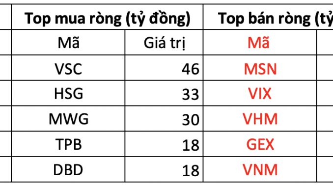 Tại chiều mua, tâm điểm mua ròng là cổ phiếu chứng khoán VSC và HSG với giá trị 46 tỷ đồng và 33 tỷ đồng. Bên cạnh đó, MWG và TPB là hai cổ phiếu được mua ròng lần lượt 30 và 18 tỷ đồng trên HOSE.