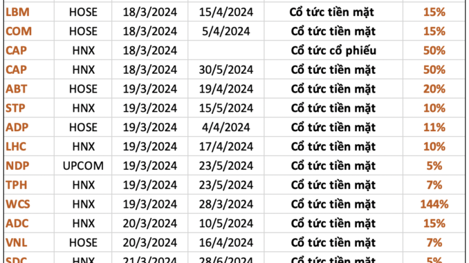 Theo thống kê, có 16 doanh nghiệp thông báo chốt quyền cổ tức trong tuần 18/3 – 22/3, trong đó, 15 doanh nghiệp trên đều chi trả cổ tức bằng tiền mặt, 1 doanh nghiệp trả cổ phiếu kết hợp. Tỷ lệ doanh nghiệp trả cổ tức tiền mặt tuần này khá cao khi có đến 8 doanh nghiệp trả cổ tức trên 15%, mức cao nhất là 144% và thấp nhất là 5%.
