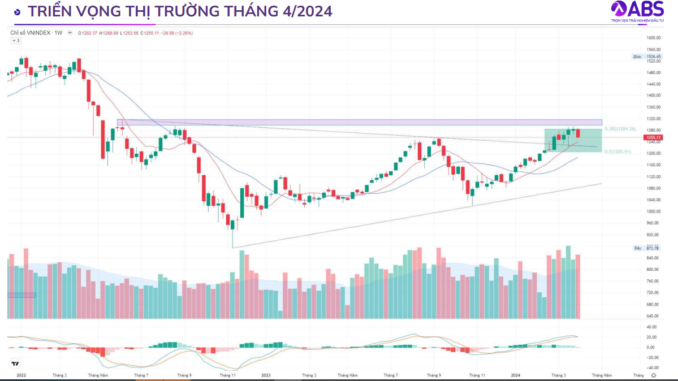ABS đưa ra hai kịch bản cho VN-Index trong tháng 4. Với kịch bản xác suất cao, CTCK này cho rằng thị trường chung đi vào vùng rủi ro điều chỉnh ngắn hạn trong tháng 4, nhà đầu tư ưu tiên thoát khỏi vị thế giao dịch ngắn hạn, hạ tỷ trọng các vị thế giao dịch trung hạn. Trong quá trình thị trường điều chỉnh là cơ hội đối với những ngành và cổ phiếu có KQKD Q1 tích cực và đang có tín hiệu tích lũy theo mô hình trên biểu đồ tuần.