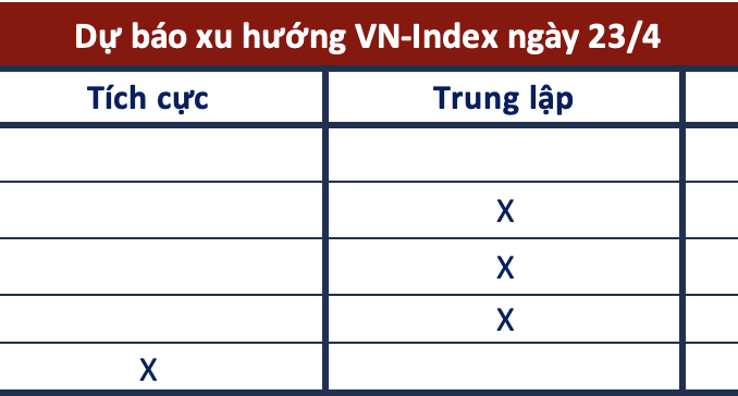 Kết phiên 22/4, VN-Index tăng 15,37 điểm (+1,31%) để lên 1.190 điểm. Tuy nhiên, thanh khoản khá thấp, giá trị khớp lệnh trên HoSE chỉ đạt xấp xỉ 14.000 tỷ đồng. Khối ngoại giao dịch kém tích cực khi bán ròng 172 tỷ đồng trên toàn thị trường.