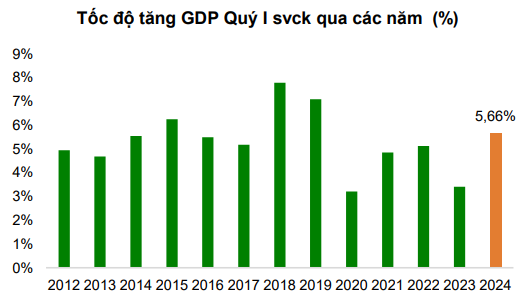 Trong báo cáo mới cập nhật, Chứng khoán Agribank (Agriseco Research) đánh giá kinh tế vĩ mô trong nước quý 1/2024 đã có sự khởi đầu tích cực như hoạt động xuất khẩu tăng trưởng gần 20% so với cùng kỳ với xuất siêu duy trì mức cao; vốn FDI duy trì đà tăng trưởng hai chữ số, giải ngân đầu tư công tiếp tục tích cực và lạm phát vẫn trong tầm kiểm soát. Mức tăng trưởng GDP quý 1 đạt 5,66% đang cao hơn so với kịch bản tăng trưởng quý 1 từ 5,2% – 5,6%.