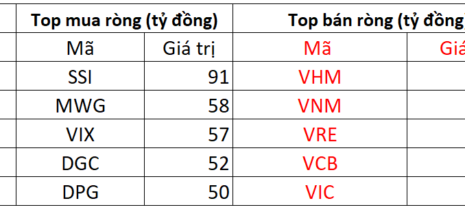 Tại chiều mua, cổ phiếu SSI được khối ngoại mua ròng mạnh tới 91 tỷ đồng. Bên cạnh đó, MWG và VIX là hai cổ phiếu tiếp theo được mua ròng lần lượt 58 và 57 tỷ đồng trên HOSE.