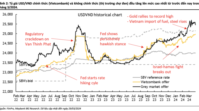 Theo Maybank IBG Research, nguyên nhân khiến VND mất giá so với USD là do: (1) lãi suất của Fed ở mức cao; (2) chênh lệch giữa giá vàng toàn cầu và trong nước ngày càng gia tăng; và (3) nhập khẩu nguyên liệu thô (như nhiên liệu, thép,…) của các doanh nghiệp trong nước ngày càng tăng.