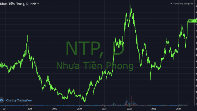 Sau khi lọt vào danh sách thoái vốn đợt 2/2024 của Tổng Công ty Đầu tư và Kinh doanh vốn Nhà nước (SCIC), cổ phiếu Nhựa Tiền Phong (NTP) đã ngay lập tức tăng dựng đứng trên sàn chứng khoán. Chỉ sau 2 phiên, thị giá NTP đã tăng 14,5% lên mức 49.000 đồng/cp, cao nhất trong vòng 26 tháng, kể từ cuối tháng 3/2022. Tạm tính theo mức thị giá này, số cổ phần Nhựa Tiền Phong trong tay SCIC (37,1% vốn) có giá trị gần 2.400 tỷ đồng.