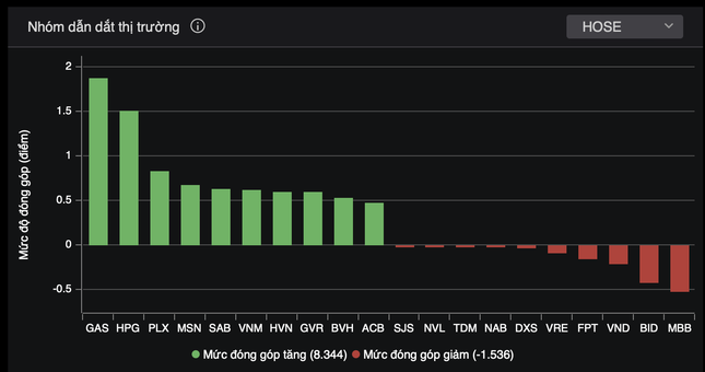 Nhóm dẫn dắt thị trường còn có HPG, MSN, SAB, VNM, HVN… Dù chưa ghi nhận đóng góp đáng kể từ nhóm vốn hoá lớn nhất – ngân hàng , nhưng đà tăng đồng đều của rổ VN30, thị trường chung cũng giúp VN-Index khởi sắc.