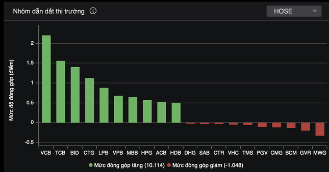 Hiệu ứng lan toả từ nhóm vốn hoá lớn dẫn dắt thị trường tăng điểm. Rổ VN30 có 24/30 cổ phiếu tăng giá, mức tăng của VN30-Index cao hơn chỉ số chính. Trong rổ VN30, HPG tiếp tục gây chú ý với việc tăng 1,3% lên 31.600 đồng/cổ phiếu, lập đỉnh mới trong 1 năm trở lại đây. Vốn hoá HPG lên mức 183.000 tỷ USD, cao thứ 5 toàn sàn, trở thành doanh nghiệp tư nhân lớn nhất sàn chứng khoán.