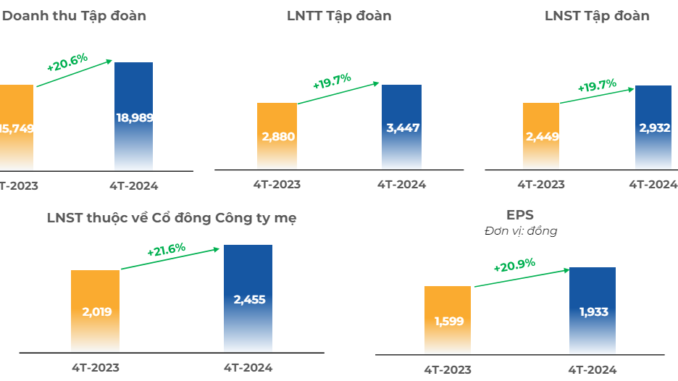 Lợi nhuận sau thuế 4 tháng đầu năm đạt 2.932 tỷ đồng, tăng 19,7% so với cùng kỳ 2023. Trong đó, lợi nhuận sau thuế thuộc về cổ đông công ty mẹ đạt 2.455 tỷ đồng, tăng 21,6% so với cùng kỳ năm trước. EPS tương ứng đạt 1.933 đồng/cổ phiếu.