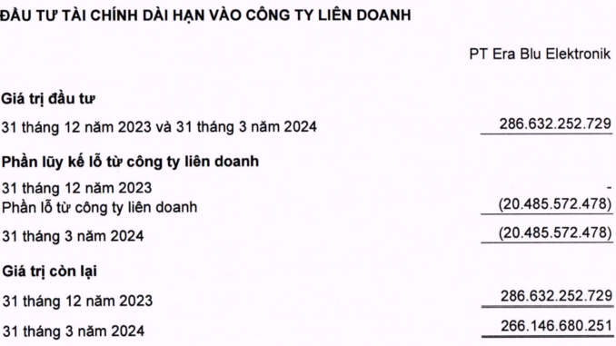 Tại cuộc họp nhà đầu tư quý 1/2024, ông Đoàn Văn Hiểu Em – thành viên HĐQT Công ty Cổ phần Đầu tư Thế Giới Di Động (MWG) đã có những chia sẻ về khoản lỗ hơn 20 tỷ từ công ty liên doanh PT Era Blu Elektronik (EraBlue) trong quý 1/2024. Theo ông Hiểu Em, mức lỗ này nằm trong kế hoạch. Và dự kiến EraBlue sẽ đạt được điểm hòa vốn, thậm chí có lãi từ quý 4/2024.