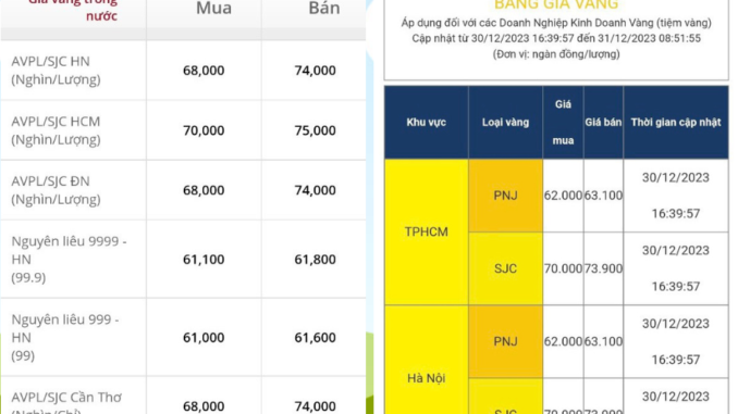 Cụ thể, trong phiên giao dịch cuối cùng của năm 2023, Công ty vàng bạc đá quý Sài Gòn – SJC niêm yết giá vàng SJC ở mức: 71 triệu đồng/lượng – 74 triệu đồng/lượng. Mức chênh ghi nhận 3 triệu đồng/lượng.