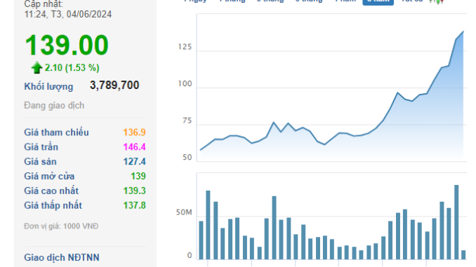 Cổ phiếu FPT vẫn đang thể hiện là tâm điểm không chỉ riêng nhóm công nghệ mà trên toàn thị trường. Thị giá tính đến cuối phiên sáng 4/6 áp sát ngưỡng 139.000 đồng/cp – mức đỉnh giá mới. Vốn hóa thị trường tương ứng đạt gần 176.400 tỷ đồng (~7,1 tỷ USD), tăng 45% so với đầu năm 2024 và giữ vững vị trí số 1 trong lĩnh vực công nghệ tại Việt Nam.